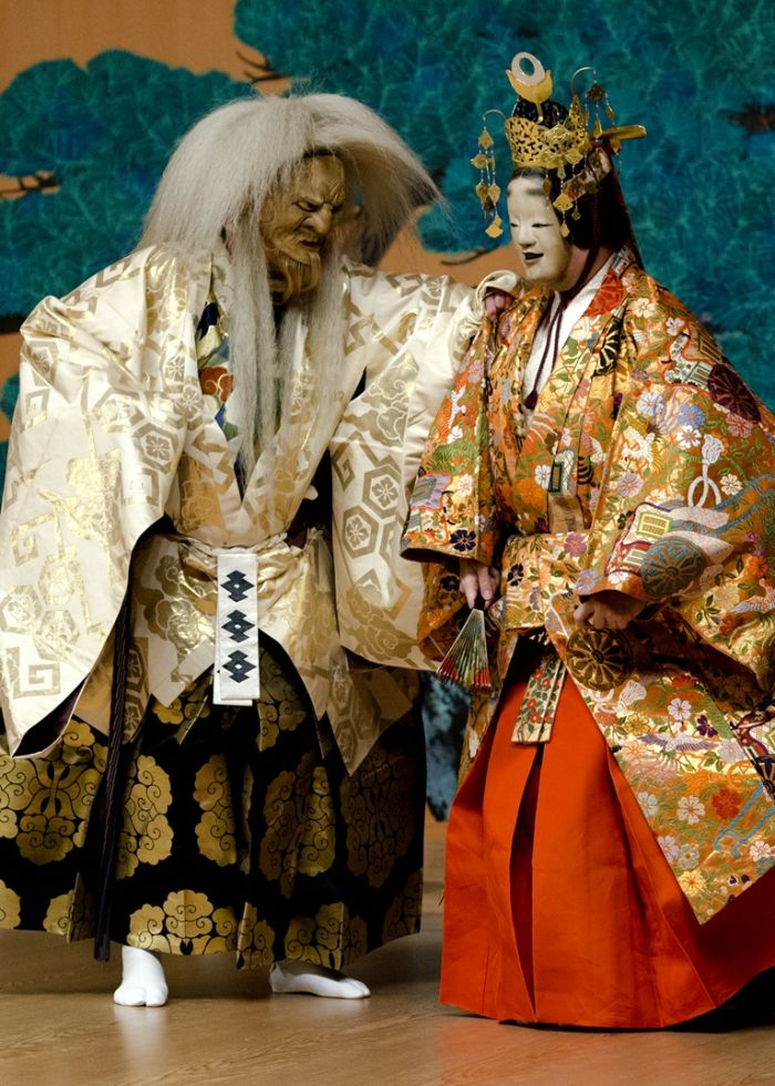 天智天皇の御所の庭掃きの老人が、宴で見かけた女御を見て恋慕に明け暮れます。池辺の桂の枝に掛けた鼓を打つ音が御所に聞こえたらもう一度姿を見せようと言う女御の言葉を伝え聞き、老人は綾絹張りの鼓は鳴るはずもなく、望みの叶えられぬことを怨んで池に身を投げます。老人の執心を慰める為に池辺に至った女御はたちまち狂気の態となり、そこへ老人の怨霊が出現し女御を責め、因果の報いを思い知らせた怨霊は鬼の姿となり再び池の淵へ身を沈めて行くのでした。